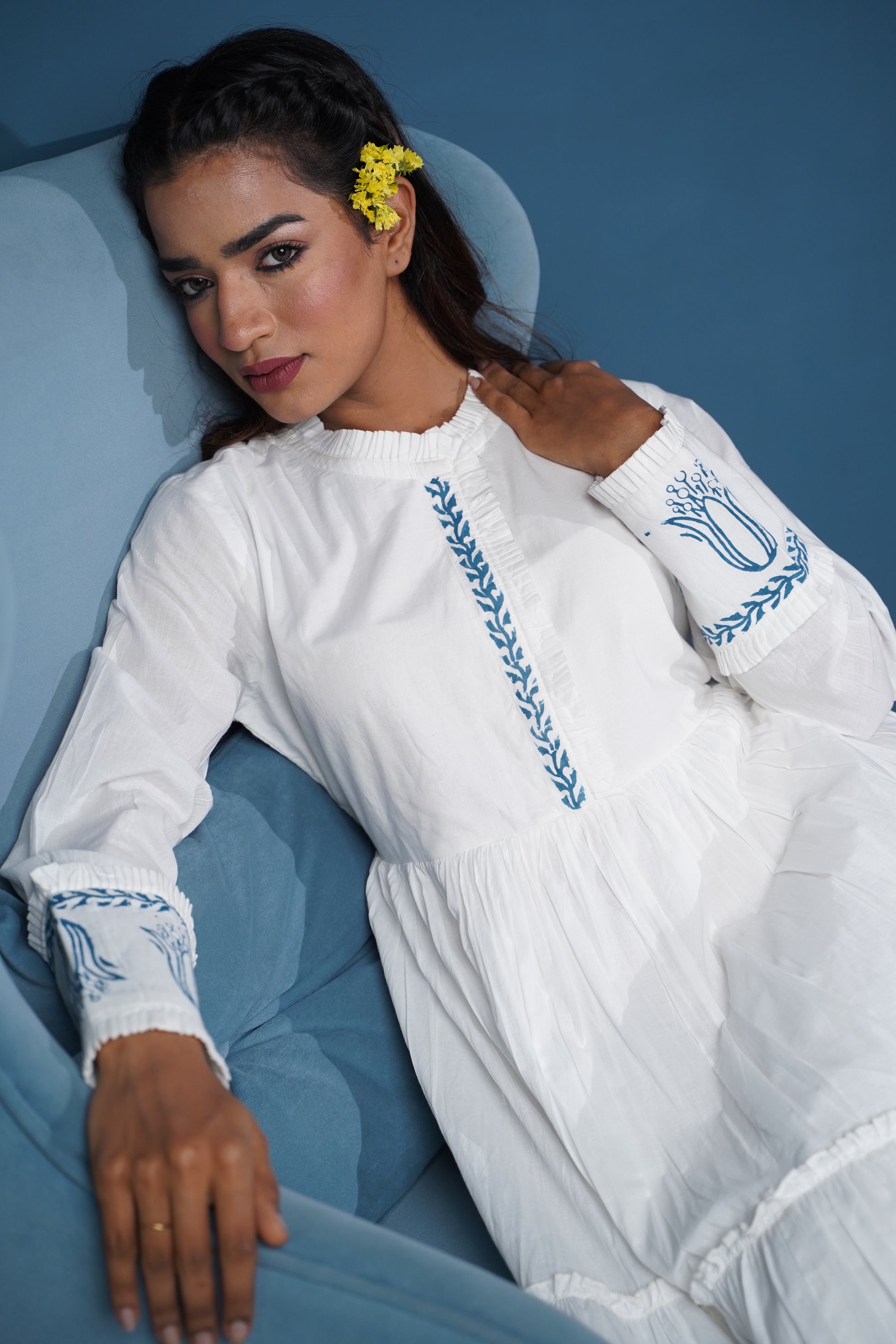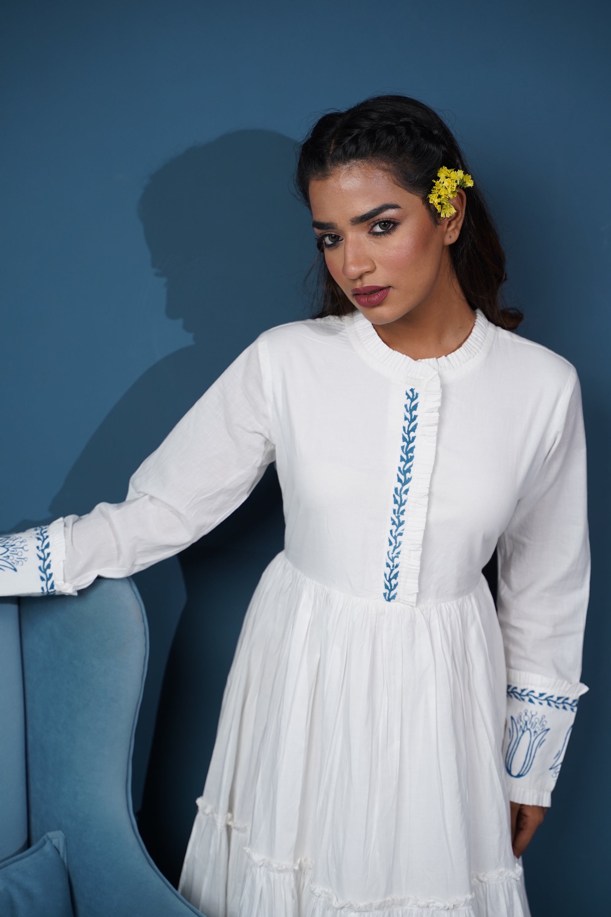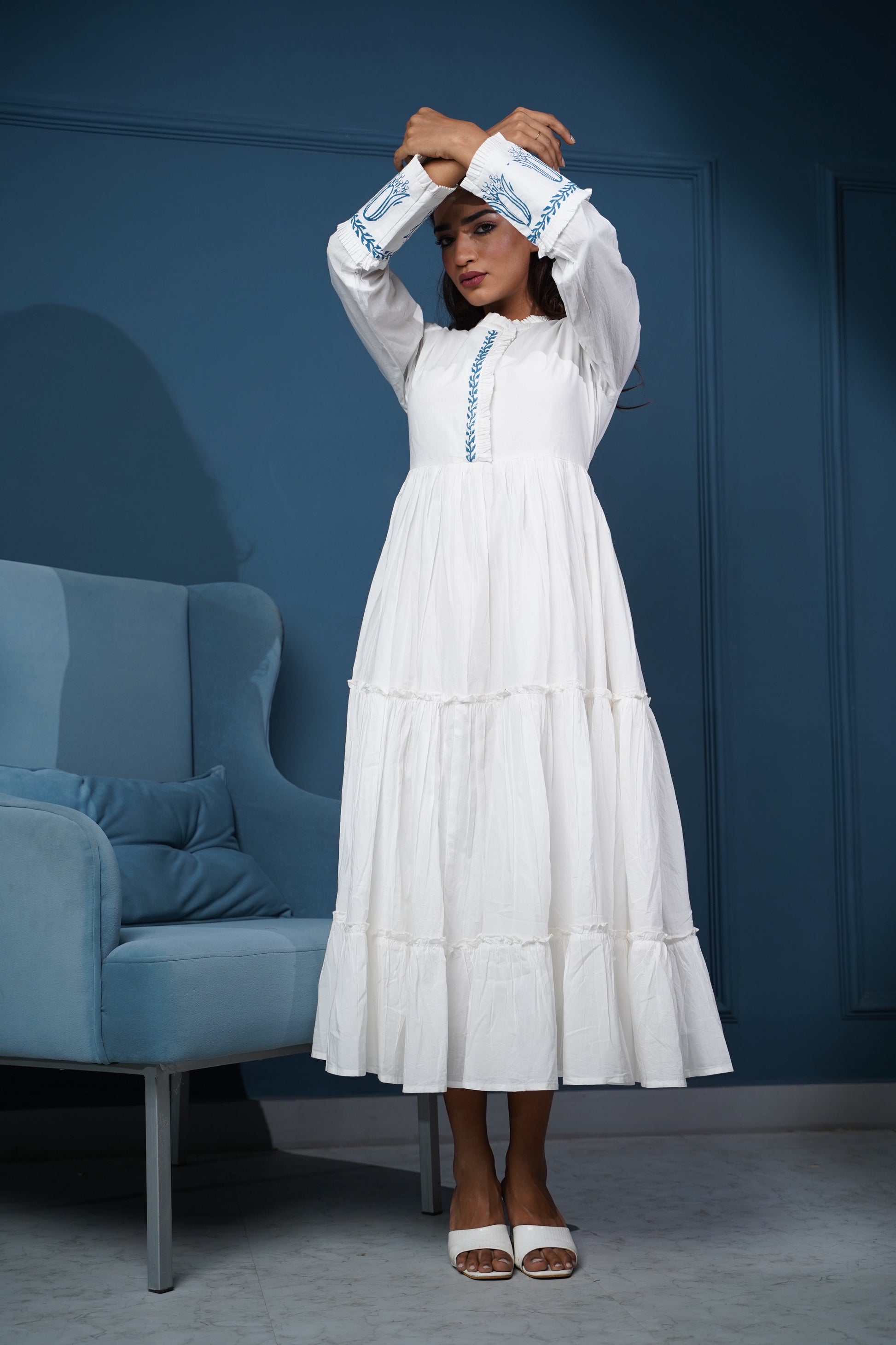 A stunning white dress with beautiful block-printed patterns, adding a unique and eye-catching touch to your wardrobe